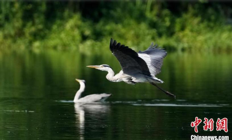 四川成都:蒼鷺在公園湖心島覓食嬉戲